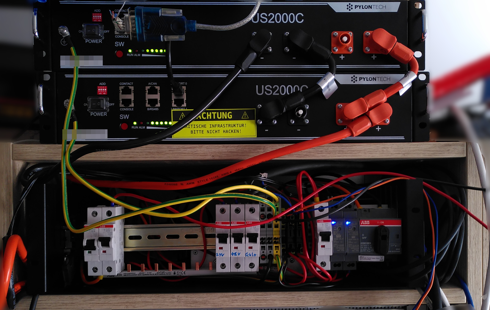 Zwei 19"-Einbauspeicher mit insgesamt 4.8kWh Kapazität stützten das System bei Dunkelheit bzw. Stromausfall für ca. 2.5 Tage. Damit sollte eine möglichst große Autarkie erreicht werden. Gegebenfalls könnte man hier auch noch nachrüsten.