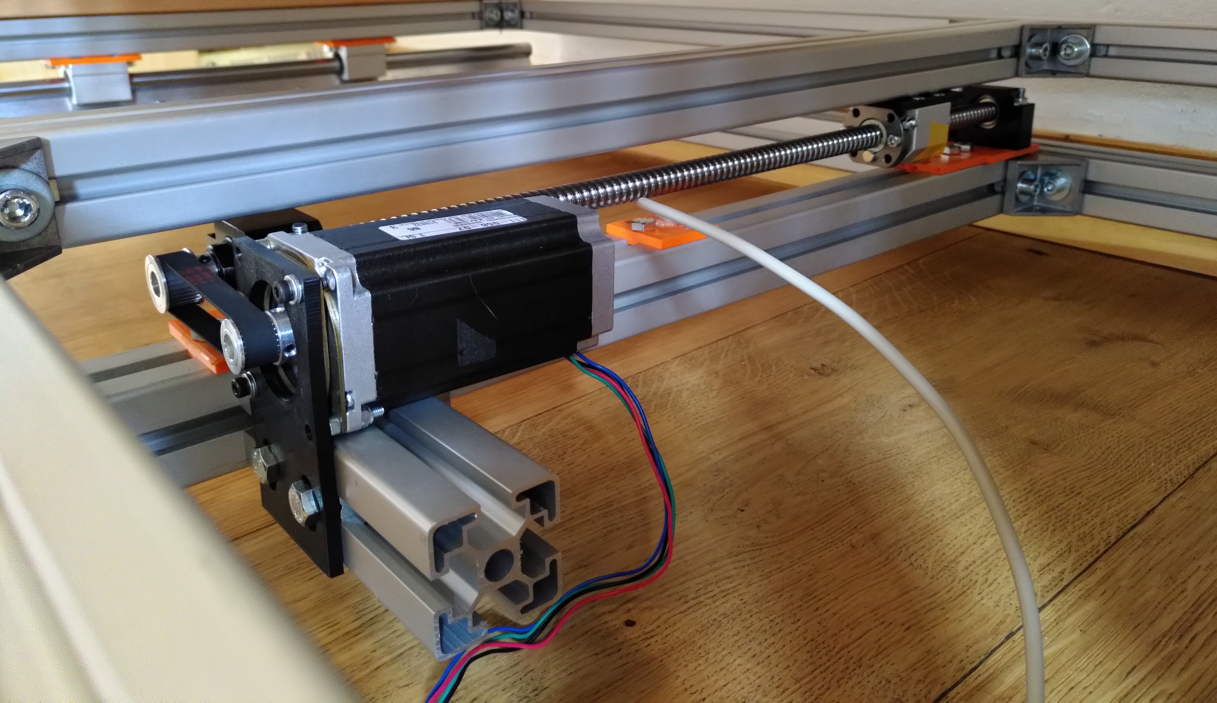 Der Antrieb erfolgt über eine Kugelumlaufspindel des Typs SFU1605-3. Diese wird von einem Schrittmotor des Typs 23HS2430 (1,8 Grad/Schritt, 4.8V Nennspannung, 3A/Phase max.) über einen Zahnriemenantrieb angetrieben.