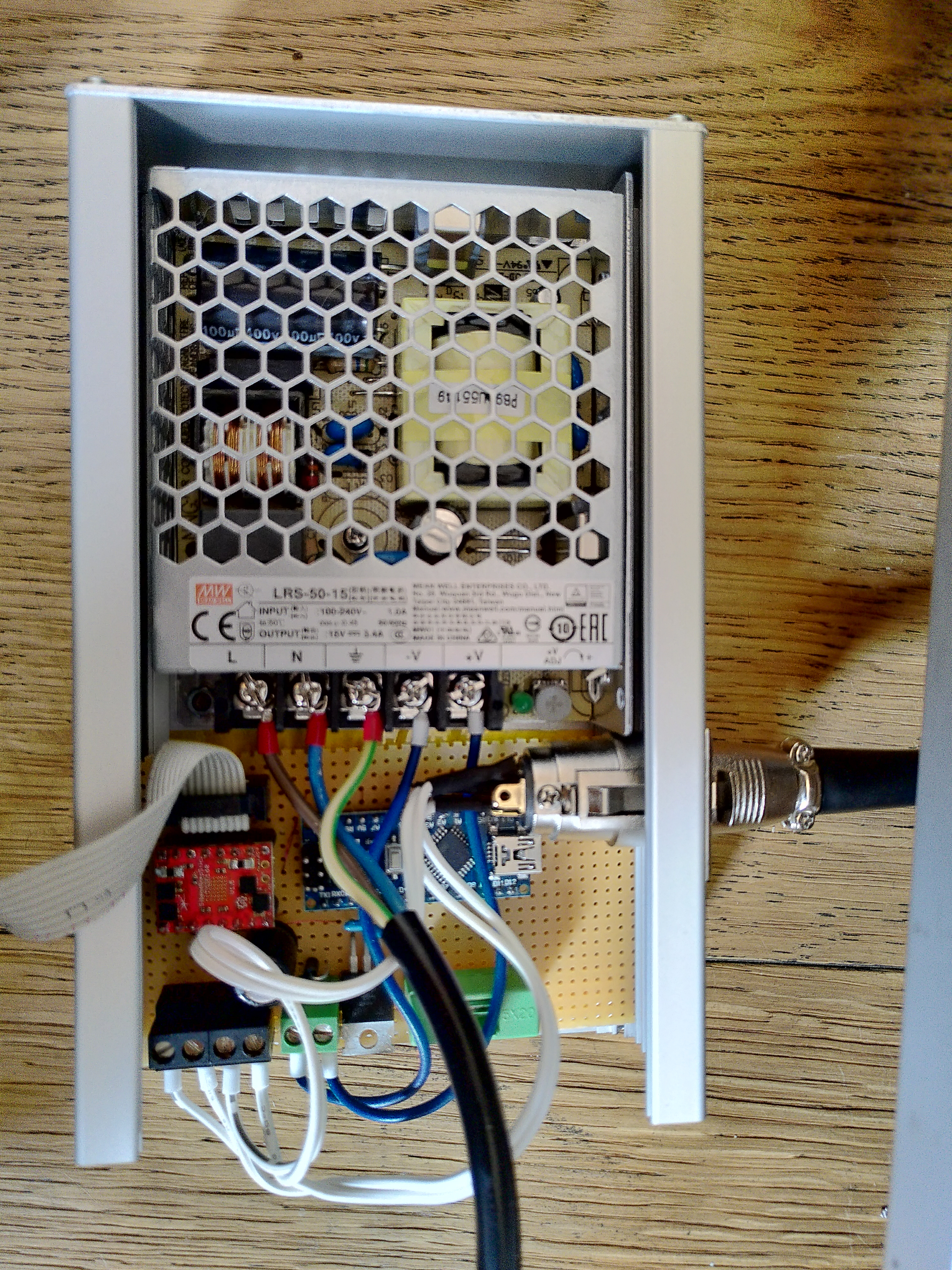 Das Netzteil passt mitsamt Controller in ein Standardgehäuse. Die Anschlüsse in Form von DB-9 für die Endschaltersignale und 5-Pol XLR sind robust ausgelegt und sollten hoffentlich den harten Alltag im Kinderzimmer überleben. Das Stromversorgungskabel wird mittels einer geschraubten Kabeldurchführung fixiert und sollte damit auch kein Sicherheitsrisiko darstellen.