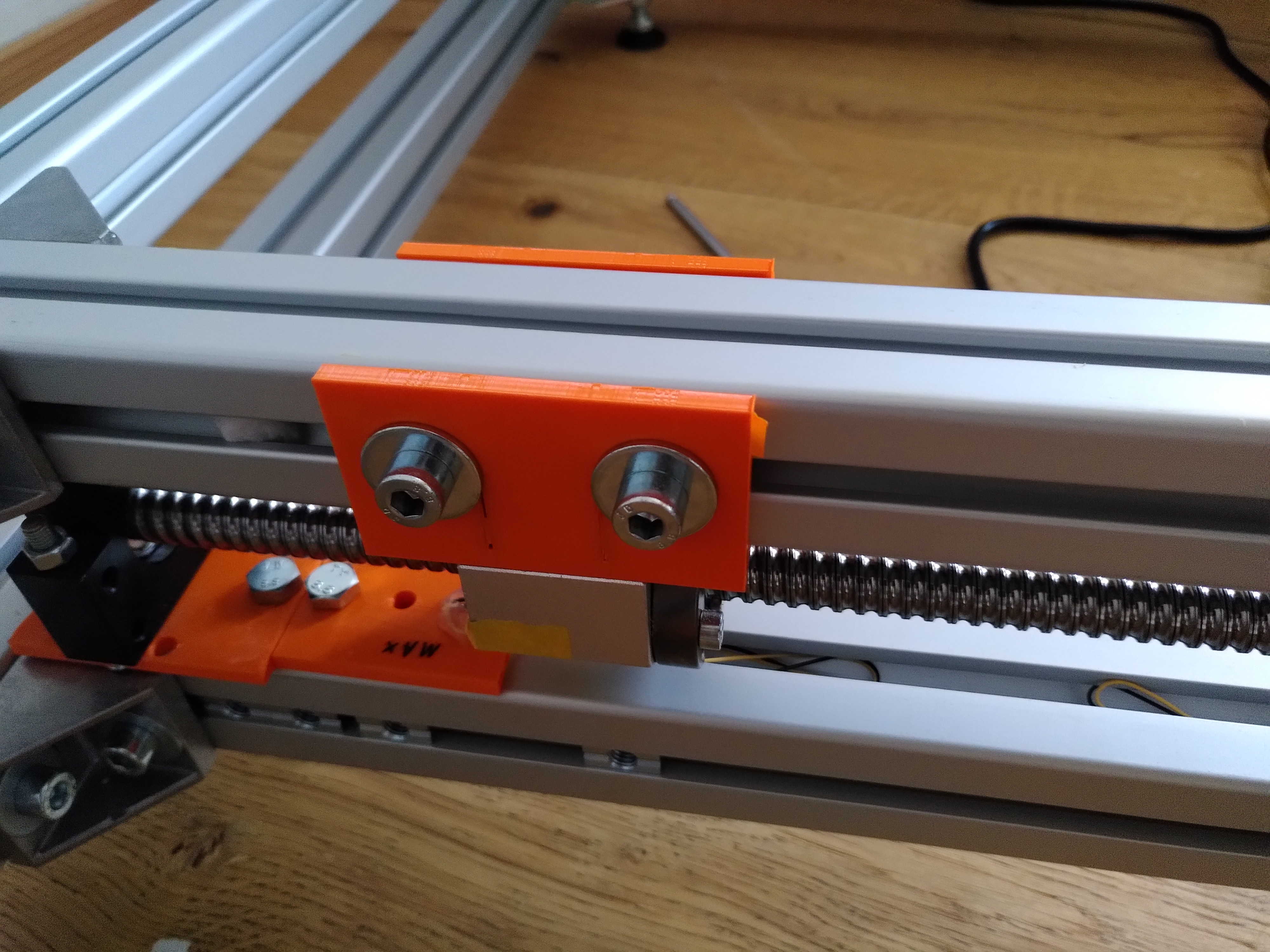 Als Endschalter dienen zwei Reed-Kontakte, die auf 3D-(Fehl)drucken sitzen und sich in der Nut unterhalb des Wellenmutterhalters bewegen lassen. Die passenden Magneten sind auf dem Halter aufgeklebt. So lässt sich der maximale Verfahrweg relativ gut einstellen.