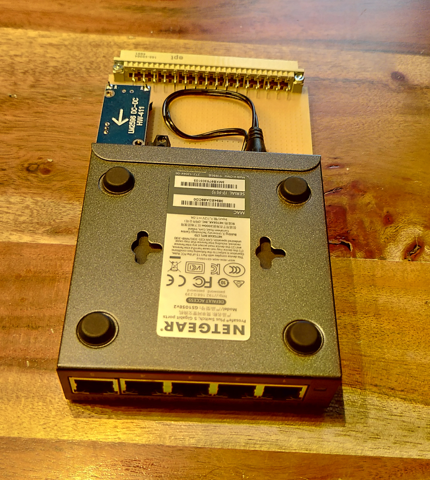 Die Netgear GS105x-Serie passt exakt auf Lochrasterplatinen mit Messerleisten. Auch ein LM2596 samt Beschaltung passt problemlos auf die Karte, sodass sich eine modulare Netzwerkinfrastruktur aufbauen lässt.