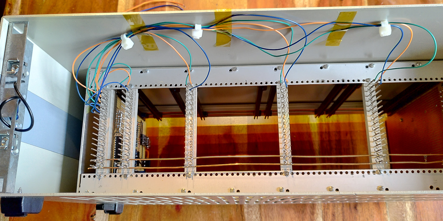 Der Bus ist relativ einfach aufgebaut, hierzu wurden Federleisten mit langen Pins, wie sie z.B. für Wire-Wrap-Aufbau genutzt wurden, in den Träger eingeschraubt.