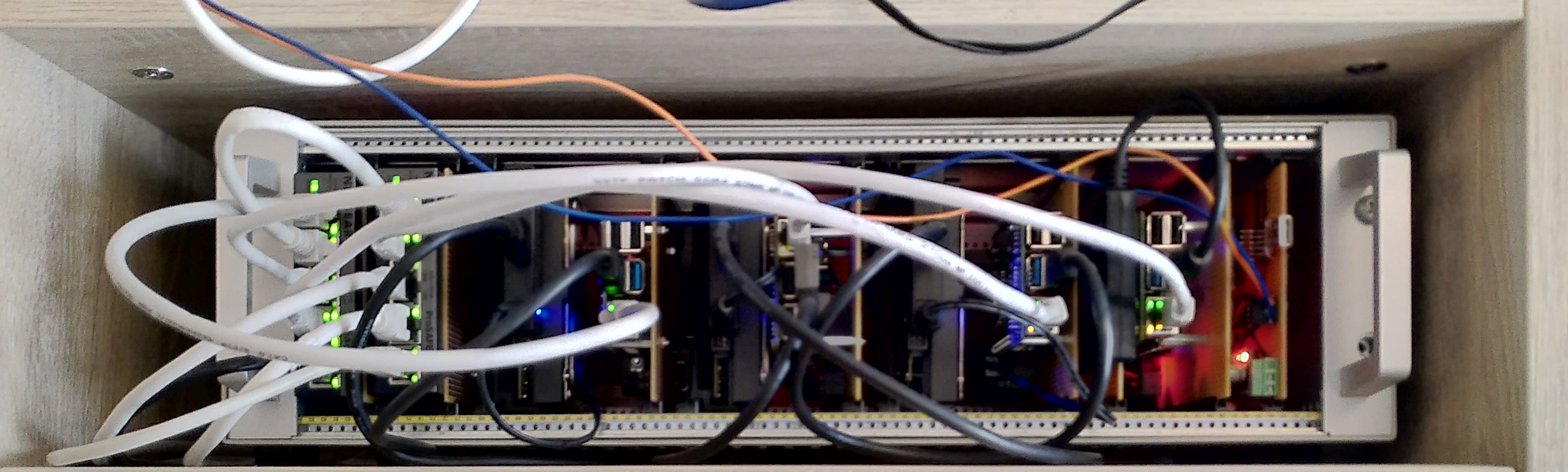 Beim Betrieb mehrerer Raspberry PI oder ähnlicher kleiner moderner Rechner kommt es schnell zu Kabelsalat. Normalerweise braucht man ein Netzteil pro Rechner, ein Netzwerkkabel, eventuell auch noch externe USB-Festplatten. Will man dann noch auf das Gerät lokal (ohne SSH) zugreifen, kommen dann noch HDMI-Kabel, Tastatur und ggf. eine Maus dazu.